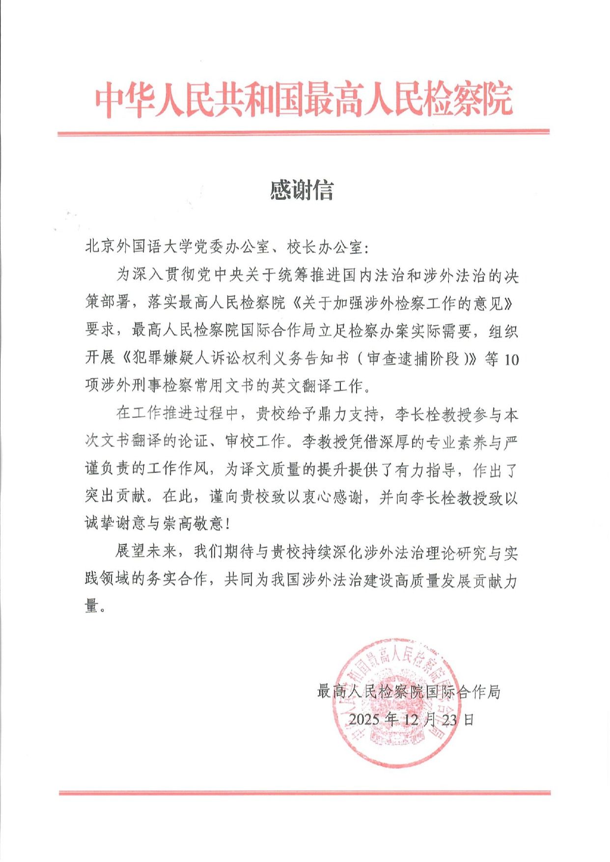 ——高翻学院李长栓教授收到最高检感谢信近日,最高人民检察院向pg娱乐电子游戏官网入口发来感谢信,致谢pg娱乐电子游戏官网入口副院长李长栓教授在“涉外刑事检察常用文书统一英译本”项目中的突出贡献。感谢信指出:“李教授参与本文书翻译的论证、审校工作。李教授凭借深厚的专业素养与严谨负责的工作作风,为译文质量的提升提供了有力指导,作出了突出贡献。”2025年12月,最高人民检察院国际合作局组织翻译的10种涉外刑事检察常用文书英译本在检察业务应用系统2....