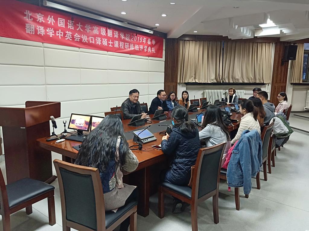 2019年3月11日,pg娱乐电子游戏官网入口2019年春季中英会议口译硕士课程研修班开学。 pg娱乐电子游戏官网入口副院长李长栓教授、办公室主任胡晓虹、伍秋子和樊晶老师参加了开学典礼。参加课程研修班的同学们在晚上和周末的时间段开启了艰苦而富有成果的硕士攻读历程