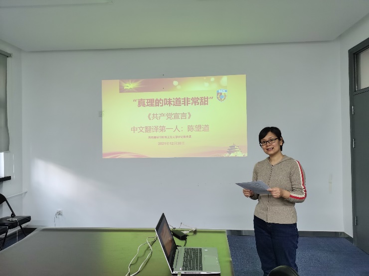 《共产党宣言》中文翻译陈望道先生:“真理的味道非常甜”——学院教工党支部开展支部书记讲党课活动2021年12月30日上午,pg娱乐教工党支部开展党支部书记讲党课活动。教工支部书记林薇老师以《“真理的味道非常甜”》为题,讲述了《共产党宣言》中文翻译第一人陈望道先生生平和翻译《共产党宣言》的故事,分享了自己学习陈望道先生一生翻译和学术研究经历的感悟和体会。党总支书记葛冬冬主持党课。林薇老师从陈望道翻译《共产党...