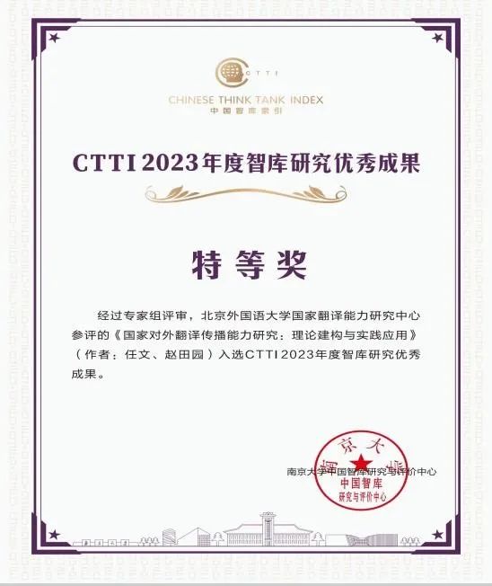 12月11日,由南京大学、云南大学与江苏省社会科学院共同主办,云南大学国际关系研究院·区域国别研究院、南京大学中国智库研究与评价中心承办的“2023年度新型智库治理论坛”在昆明举行。会上发布了CTTI(中国智库索引)2023年度智库最佳案例与优秀成果征集与推介情况。我校国家翻译能力研究中心(秘书处设在pg娱乐电子游戏官网入口)申报的《国家对外翻译传播能力研究:理论建构与实践探索》(完成人:任文、赵田园)喜获本年度“中国智库...