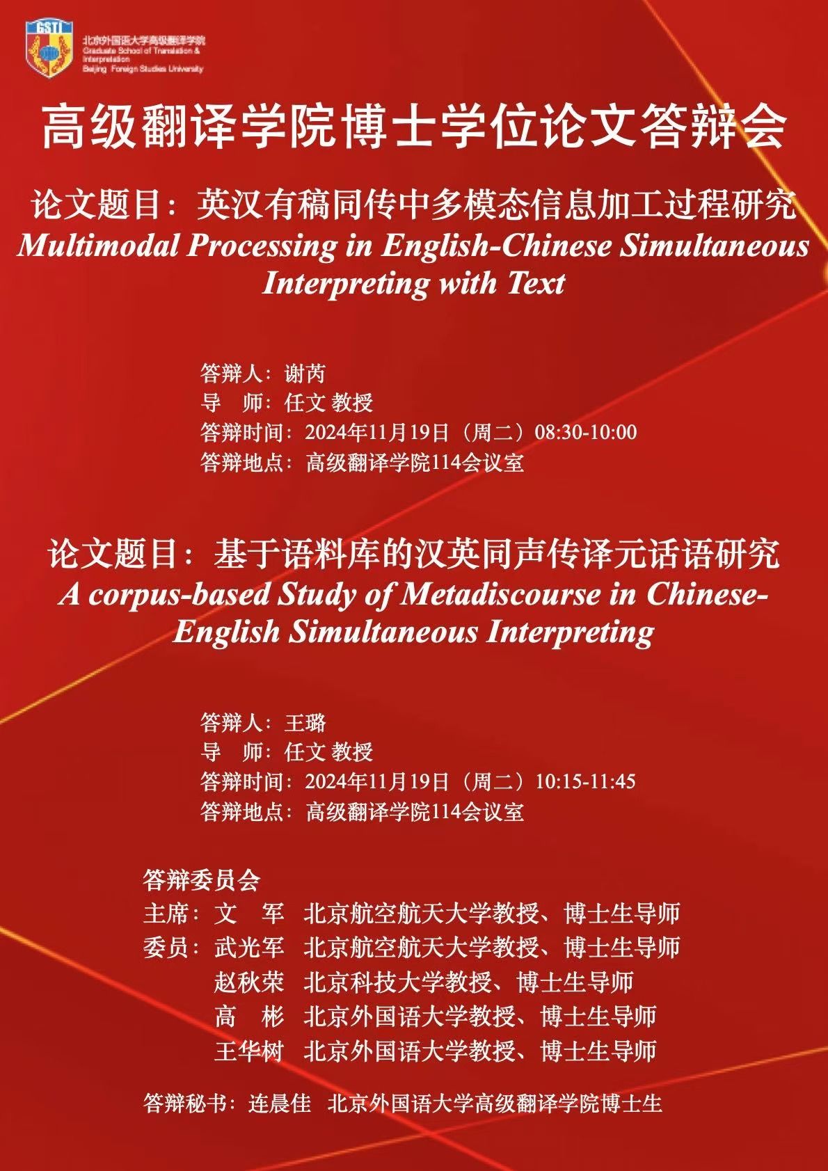 pg娱乐电子游戏官网入口博士生王璐、谢芮论文预答辩预答辩论文题目:《基于语料库的汉英同声传译元话语研究》 《有稿同传中多模态信息加工过程研究》预答辩申请人:王 璐、谢 芮导 师:任 文 教 授预答辩时间:9月29日(周日)下午 15:00-19:00预答辩会议号:腾讯会议535-773-006预答辩委员会: 主席:文 军 教 授 博 导 北京航空航天大学成员:李 德 超 教 授 博 导 香港理工大学胡 显 耀 教 授 博 导 西南大学武 光 军 教 授 博 导 ...
