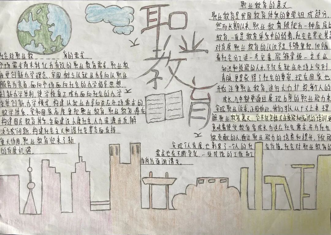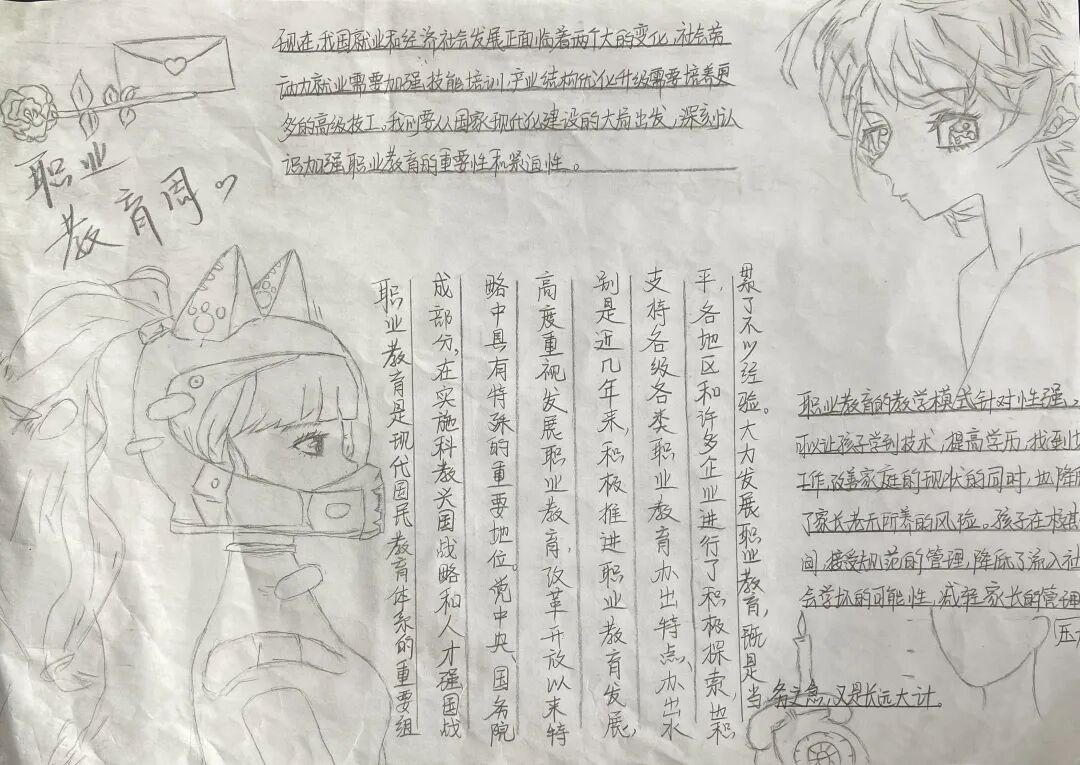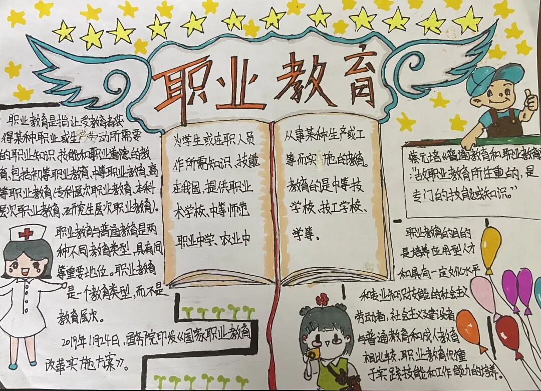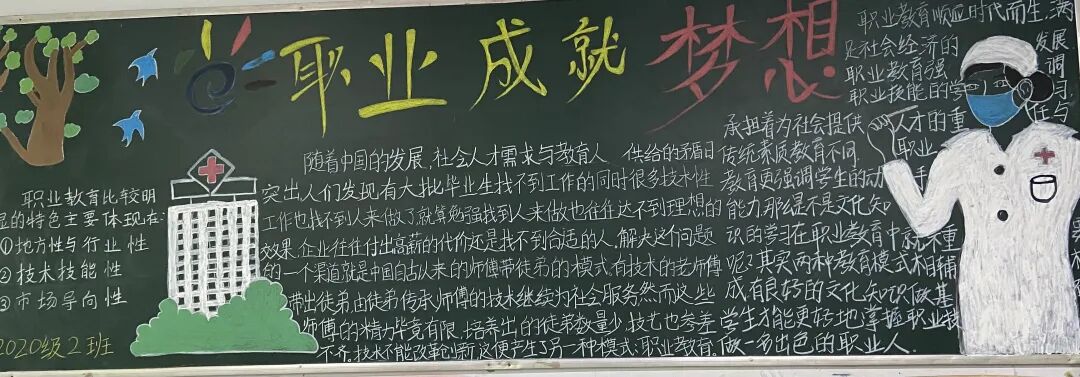 按照校团委的安排,各班根据自己班级的特点,充分调动学生积极参与、精心制作。本次参评的黑板报一共5份,手抄报25份,参赛作品创意新颖、图文并茂、版面精致,充分彰显了当代中职学生的能力和风采。校团委老师们对黑板报和手抄报作品从标题、字体、图案、文字内容、版面效果、创新项目进行评选打分。 黑板报评比结果如下: 第一名:2020级5班; 第二名:2020级1班; 第三名:2020级2班。 ▲图|黑板报优秀作品展示 手抄报评比结果如下: 一等奖:2020级2班 刘星、2020级5班 卢巧敏; 二等奖:2020级2班 骆丽珠、2020级2班 彭舒鑫、2020级3班 黄星欣; 三等奖:2020级1班 唐世菊、2020级2班 王乔、2020级4班 陈红、2020级4班 马飞舟、2020级4班 李晓萍。 左右滑动查看更多 ▲图|手抄报优秀作品展示 树立职业意识 铸就精彩人生 黑板报、手抄报比赛是学校2021年职业教育周系列活动之一。该活动既培养了学生的职业认知和职业素质,也展示了中职学生的个人风采,营造了尊重技能、崇尚技能、练好技能的良好氛围。