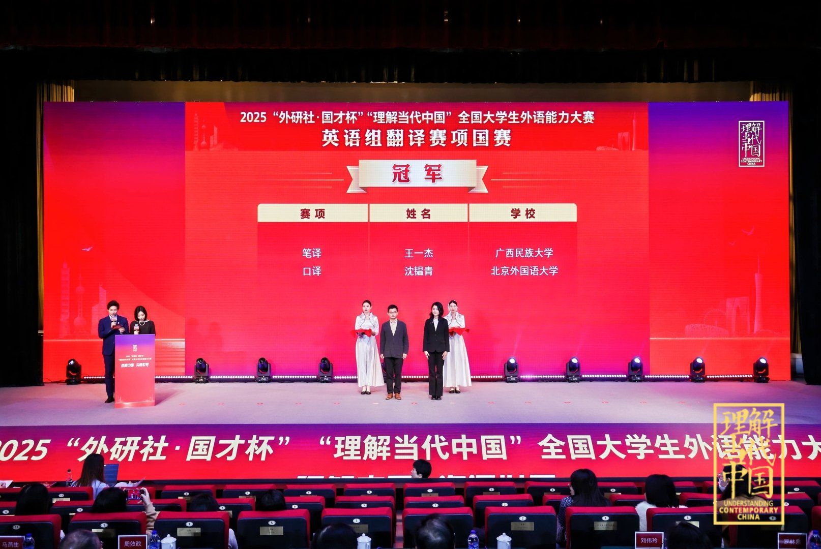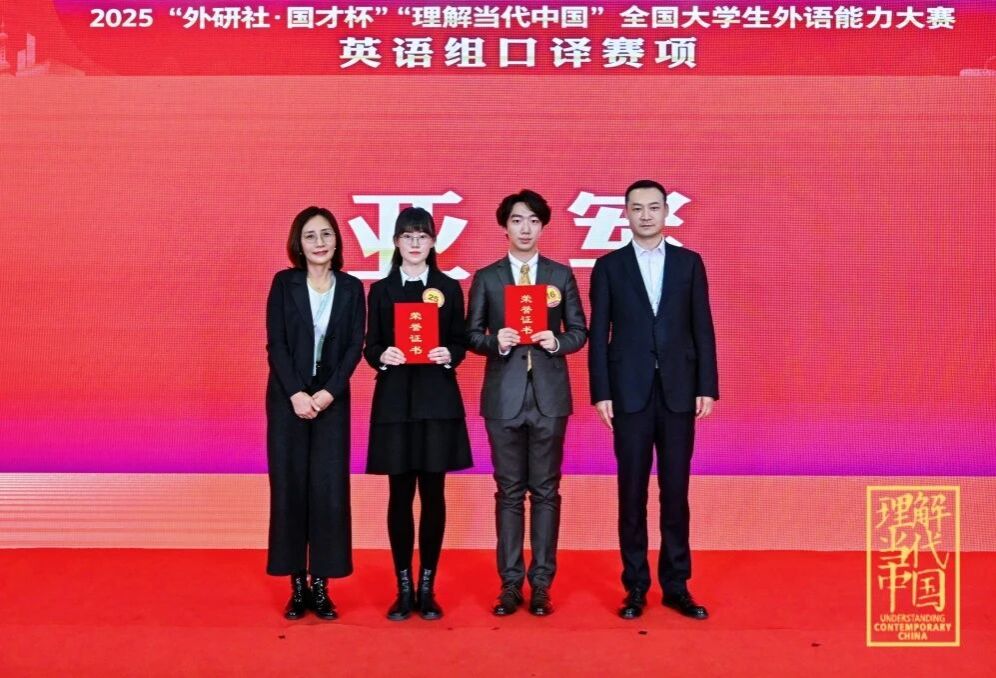 2025年12月5-8日,“外研社·国才杯” “理解当代中国”全国大学生外语能力大赛圆满落幕。在“英语组口译赛项”中,pg娱乐电子游戏官网入口学子再创佳绩。2023级英语口译(复语)硕士研究生沈韫青获得国赛金奖(冠军),指导老师:曾佳宁、张雨晴;2024级英语口译(复语)硕士研究生李如蓝获得国赛金奖(亚军),指导老师:张璐、曾佳宁;2025级英语口译硕士研究生闫思晗获得国赛金奖,指导老师:张雨晴、张璐;2025级英语口译硕士研究生马雨萌获得国赛银奖,指导老师:邓小玲。