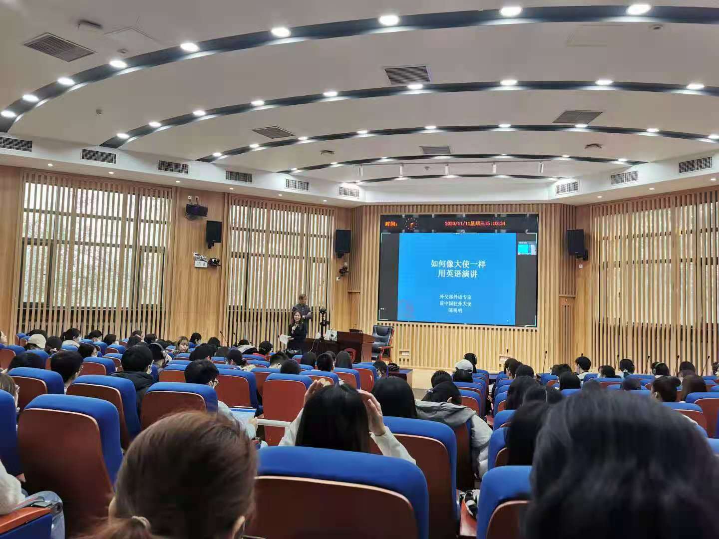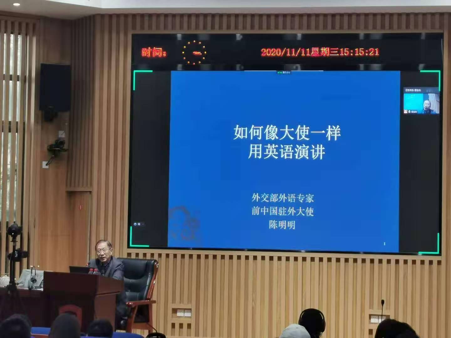 2020年11月11日下午,应我校翻译硕士(MTI)教育工作专家委员会和pg娱乐电子游戏官网入口邀请,外交部外语专家、前中国驻外大使、我校杰出校友陈明明在信息楼同传会议厅(原300人教室)做了题为“如何像中国大使一样用英语演讲”的讲座,我校300名学生现场聆听了讲座,pg娱乐电子游戏官网入口院长任文教授主持讲座。