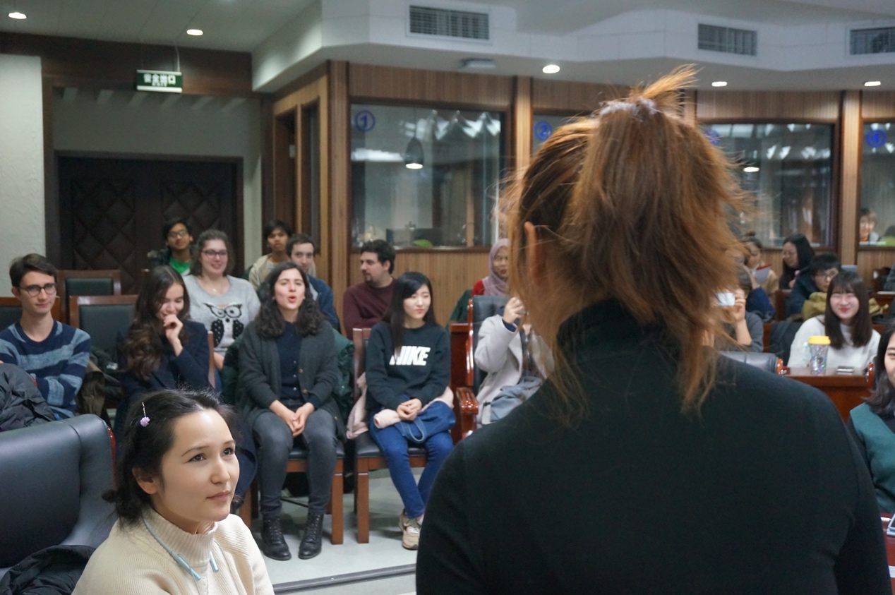 此次戏曲学习,首先王硕老师给大家讲解了博大精深的中国戏曲文化,包括各个戏曲品种,以及生旦净末丑各个戏曲行当的的特点以及典型角色。李佳柔老师带着大家学习了旦角的发音,同学们对京剧的唱腔、念白非常感兴趣,纷纷尝试。在场师生体验了京白“青春整二八,生长在贫家,露窗春寂静,空负貌如花。”,领略到了花旦的脆灵。