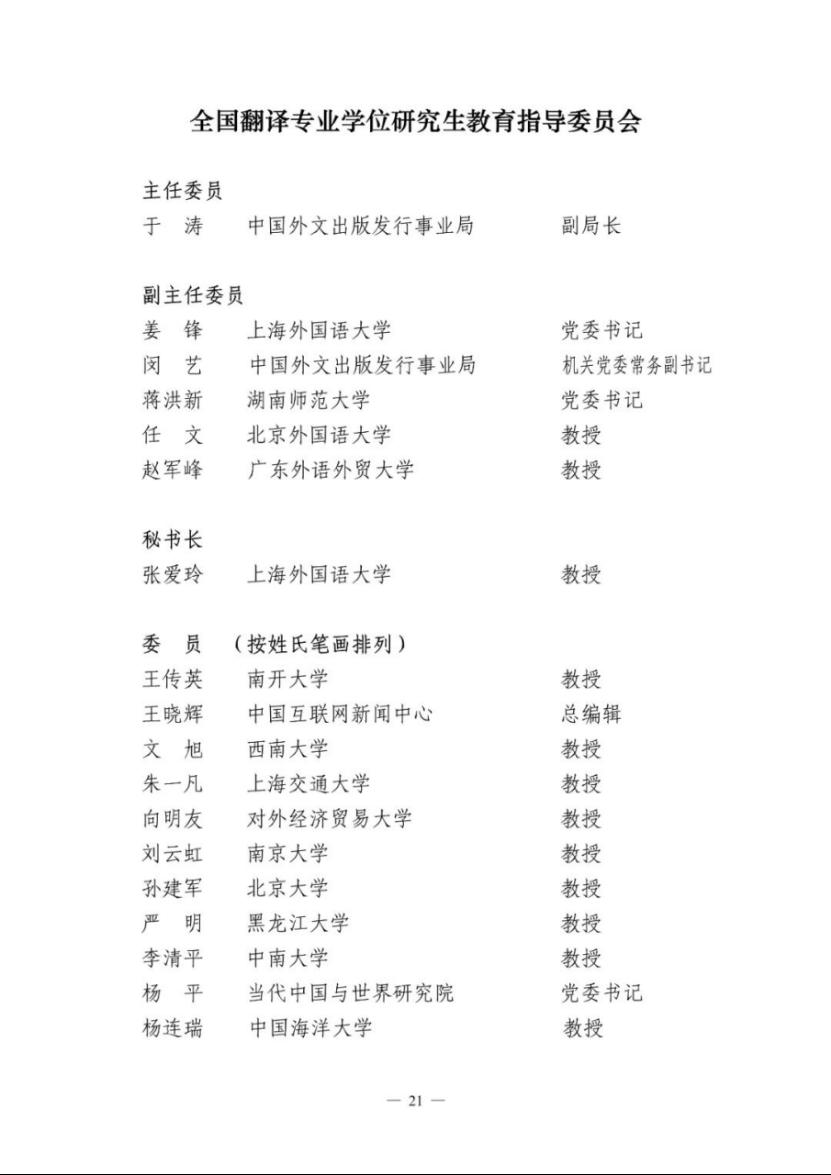 近日,国务院学位委员会、教育部和人力资源社会保障部联合发布了30个专业学位研究生教育指导委员会换届教指委名单,pg娱乐电子游戏官网入口院长任文教授当选第四届全国翻译专业学位研究生教育指导委员会副主任委员。