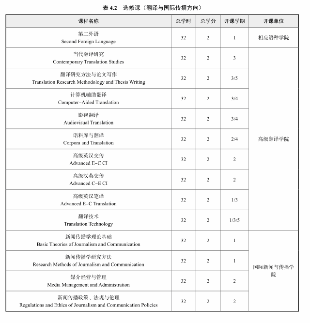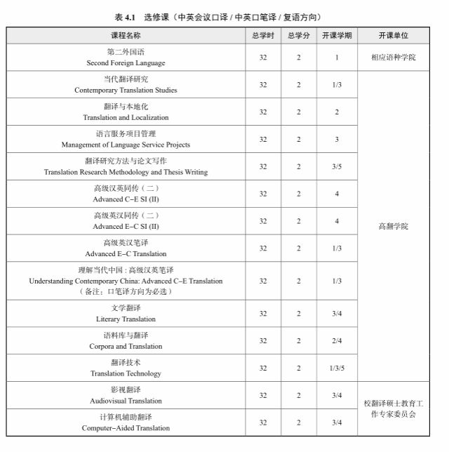 4. 选修课:不少于 14 学分,其中研究方法与论文写作、计算机辅助翻译为必选课程。