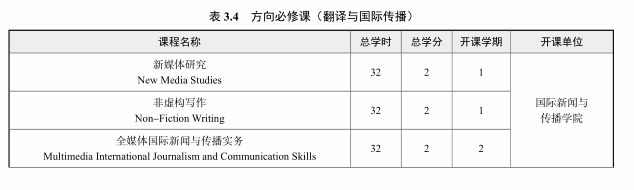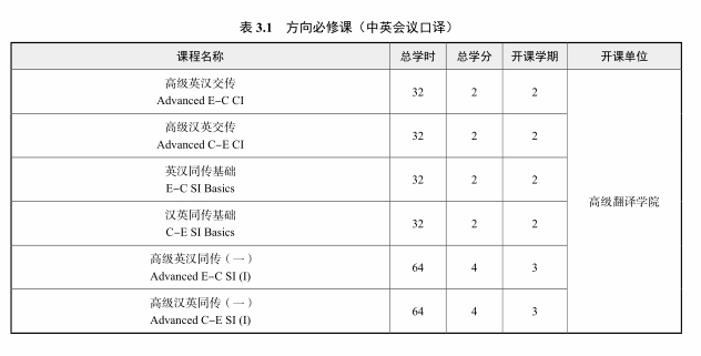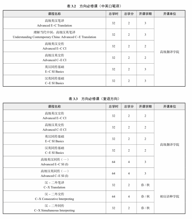 中英会议口译、中英口笔译方向总学分不低于 40 学分,翻译与国际传播方向总学分不低于 46学分,复语方向总学分不低于 46 分。
