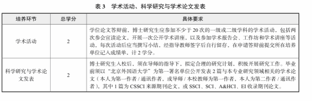 学位论文答辩前,博士研究生应参加不少于 20 次的一级或二级学科的学术活动,包括两次参会宣读论文,开展一次公开学术讲座,以及参加学术报告会、工作坊和学术讲座等活动,每次活动后应当撰写小结,经指导教师签字后自行留存,在申请答辩前提交所在培养单位记入成绩单,计 2学分。