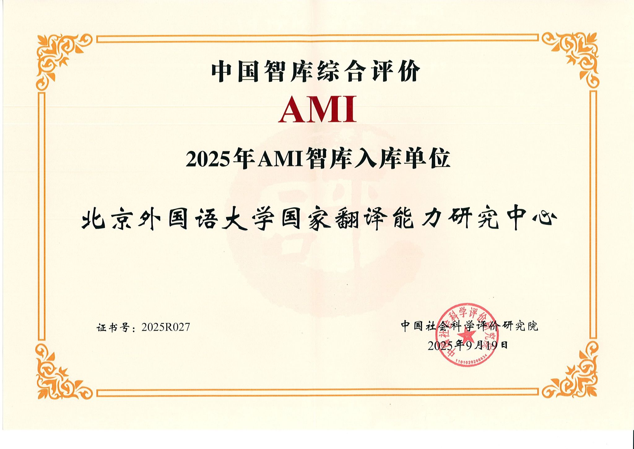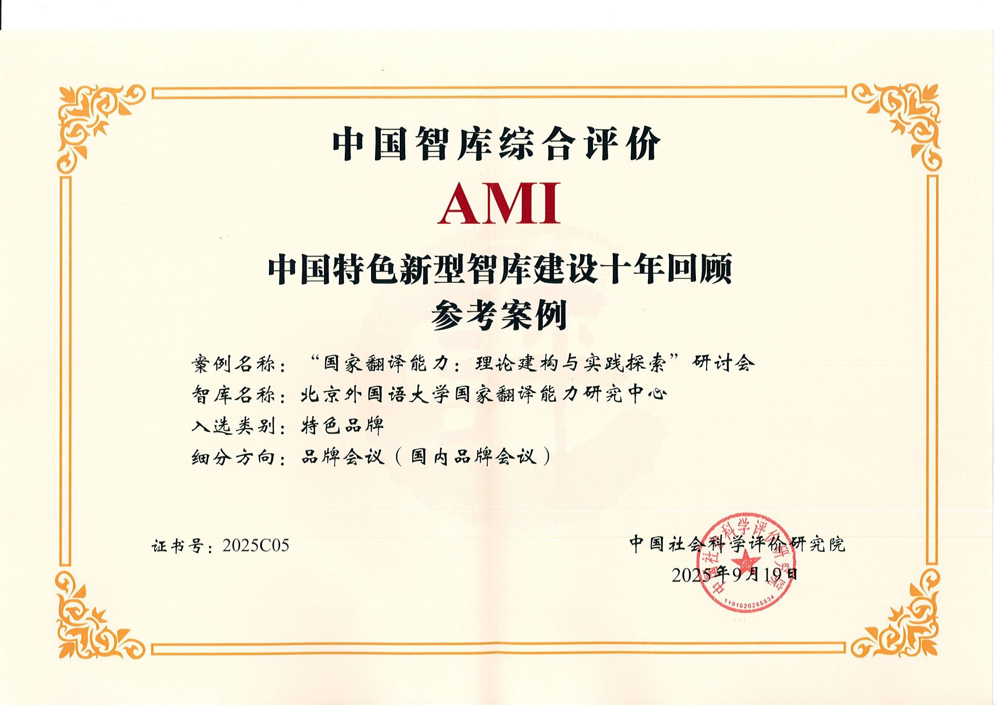 9月19日,由中国社会科学院中国社会科学评价研究院主办的“第八届中国智库建设与评价高峰论坛”在京举行。来自全国多个省市的智库主管部门、建设方代表及相关专家学者齐聚一堂,围绕智库特色品牌建设与实践经验开展专题研讨。会议正式公布了中国智库综合评价(AMI)智库入库单位名单及“中国特色新型智库建设十年回顾”特色案例名单。国家翻译能力研究中心成功入选“中国智库综合评价2025年AMI智库”名单,其主办的“‘国家翻译能力:理论建构与实践探索’研讨会”荣获“中国特色新型智库建设十年回顾参考案例”。国家翻译能力研究中心主任任文出席论坛并现场领奖。