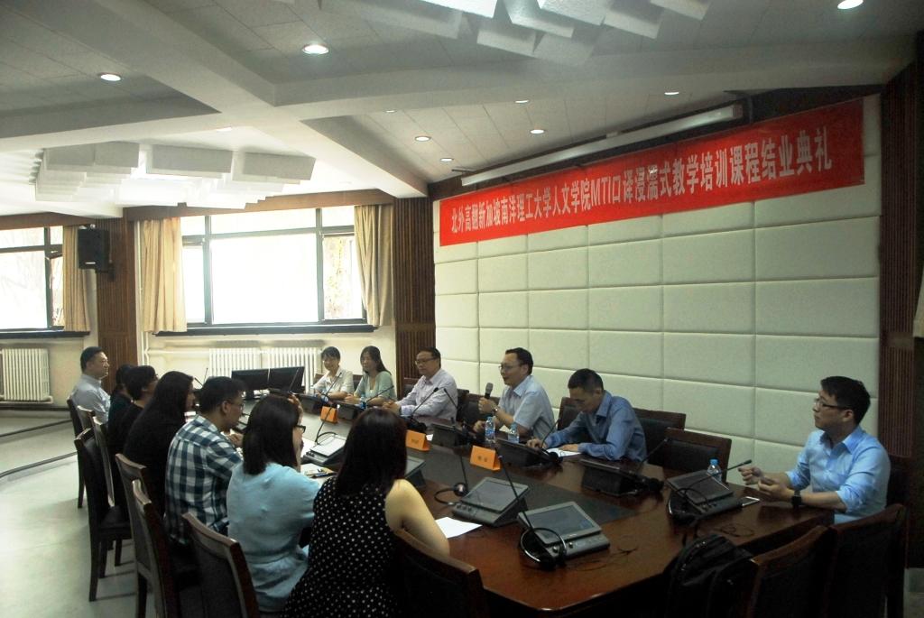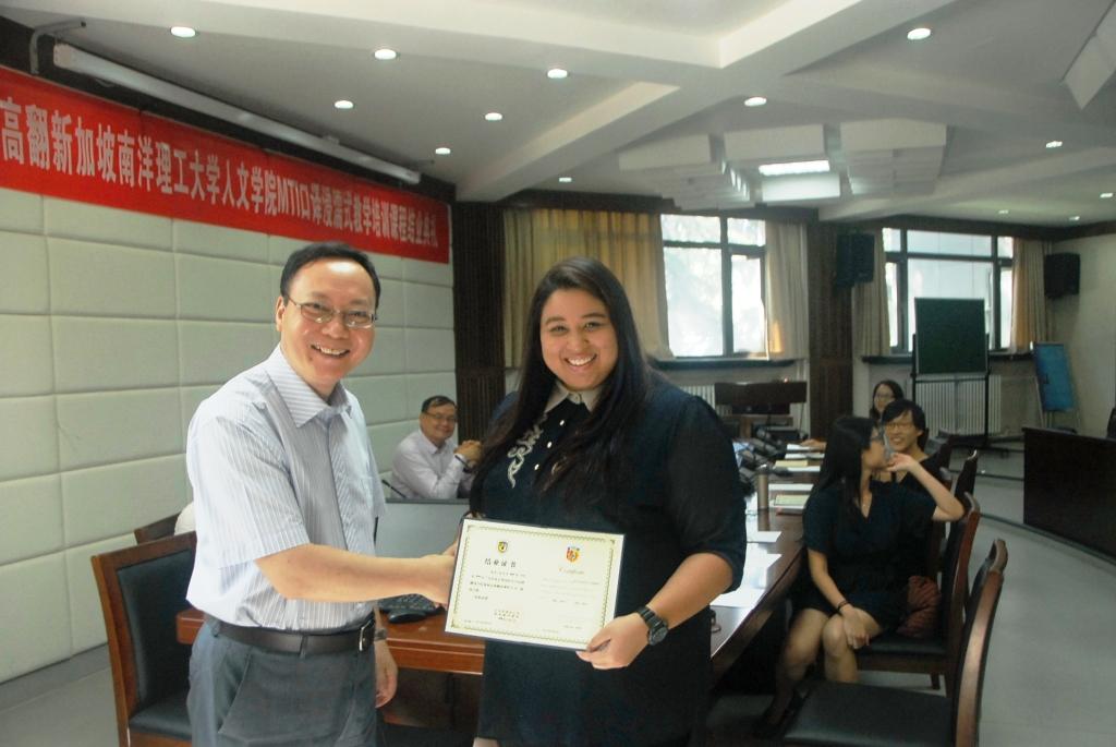 7月1日当日,pg娱乐电子游戏官网入口在国际会议室举办了简单而隆重的结业典礼,新加坡南洋理工大学人文与社科学院刘宏院长、MTI项目主任高虹博士和MTI项目经理卞蕾老师特地从新加坡赶来参加典礼。pg娱乐电子游戏官网入口副院长李长栓、副院长姚斌、办公室主任胡晓虹和任课教师曲强也一同参加了结业典礼。
