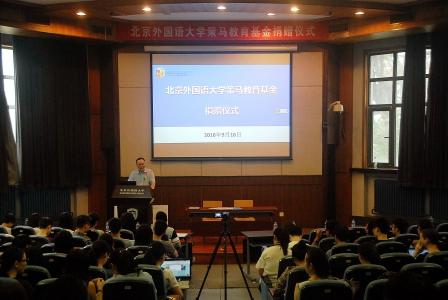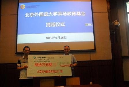 2016年9月16日上午,策马教育基金捐赠仪式在高翻学院300人礼堂举行。北京策马翻译有限公司将在未来十年共捐赠40万元专项支持高翻学院教学、科研和学生工作。双方同时还签署了共建翻译实习基地的协议。